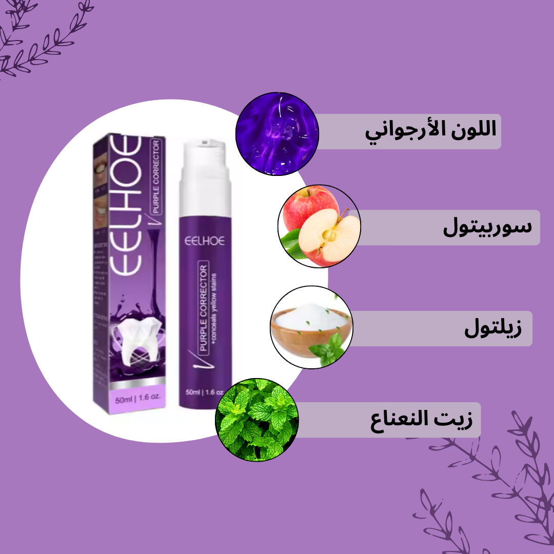 يحتوي معجون تبييض الأسنان الأرجواني على تركيبة فعّالة تشمل: